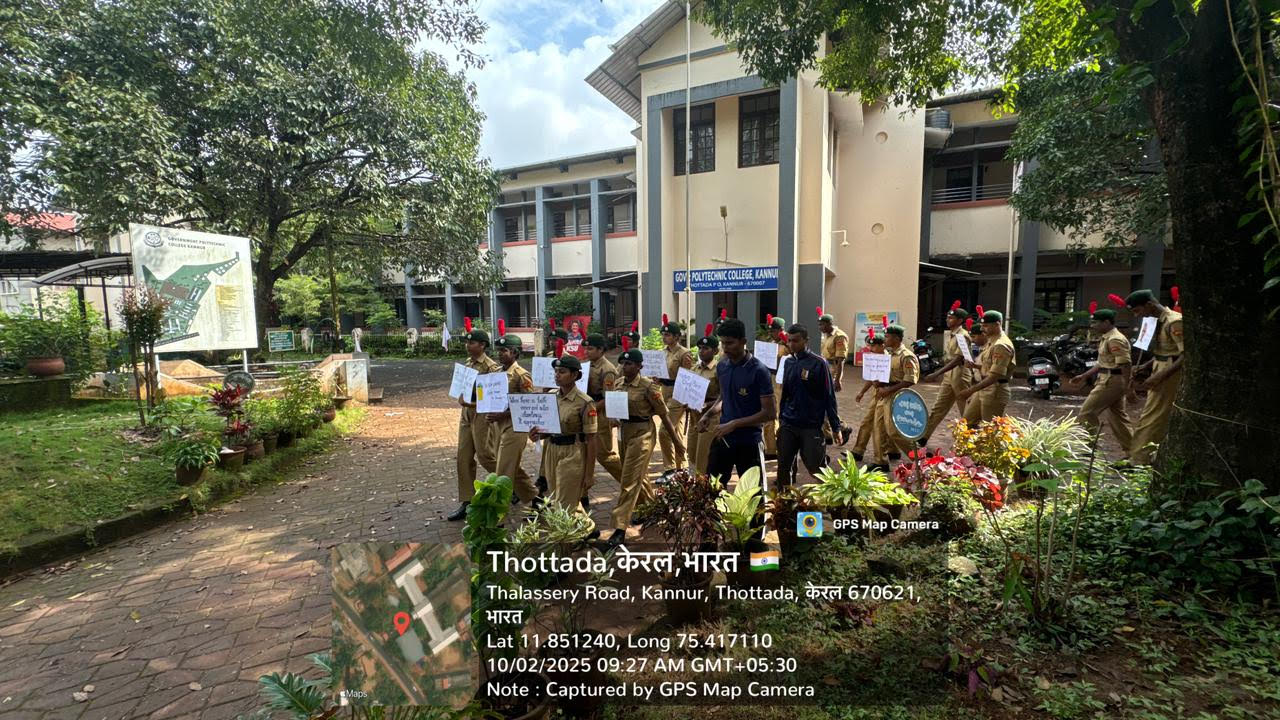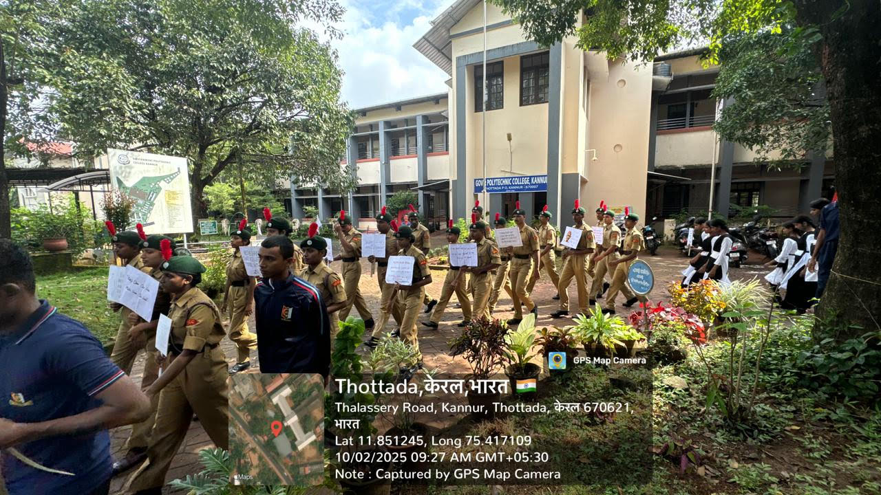 2-October-2025 ഗാന്ധിജയന്തി ദിനവുമായി ബന്ധപ്പെട്ട് ഇന്ന് കണ്ണൂർ ഗവൺമെന്റ് പോളിടെക്നിക് കോളേജിലെ എൻസിസി കേഡറ്റുകൾ സ്വച്ചോത്സവ് പ്രതിജ്ഞയും, സ്വച്ചതാ റാലിയും നടത്തി.
